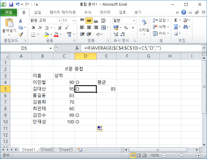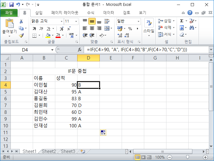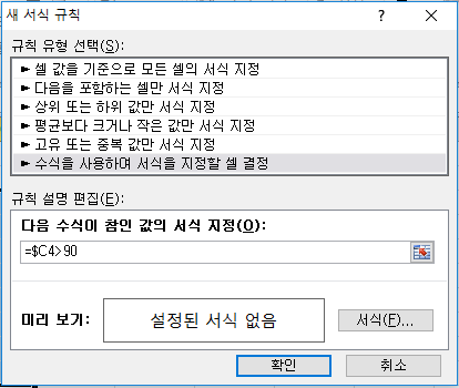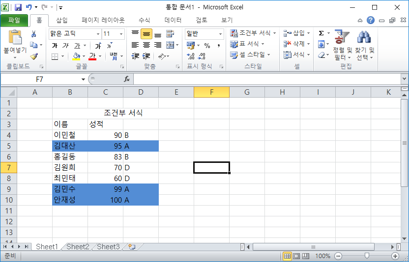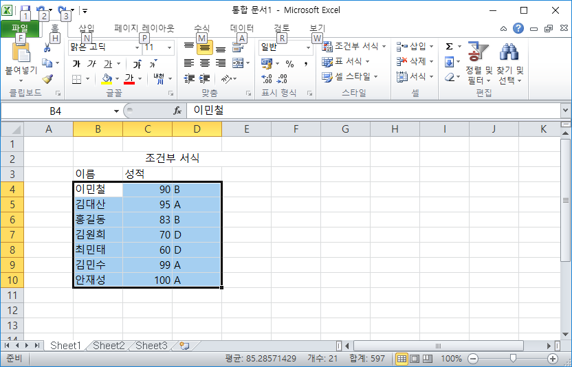 제가 설정했던 성적 90점 초과인 곳만 파랑색으로 바뀐 모습입니다.